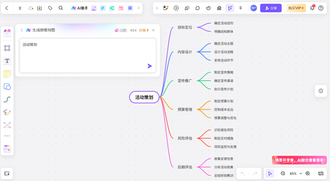 Boardmix 是一个在线白板,可以多人实时协作创建图表、流程图和思维导图等,自带的AI助手还可以根据关键词搭建基本的思维导图框架,根据自己的需求简单修改即可。个人使用免费,团队使用需要会员。