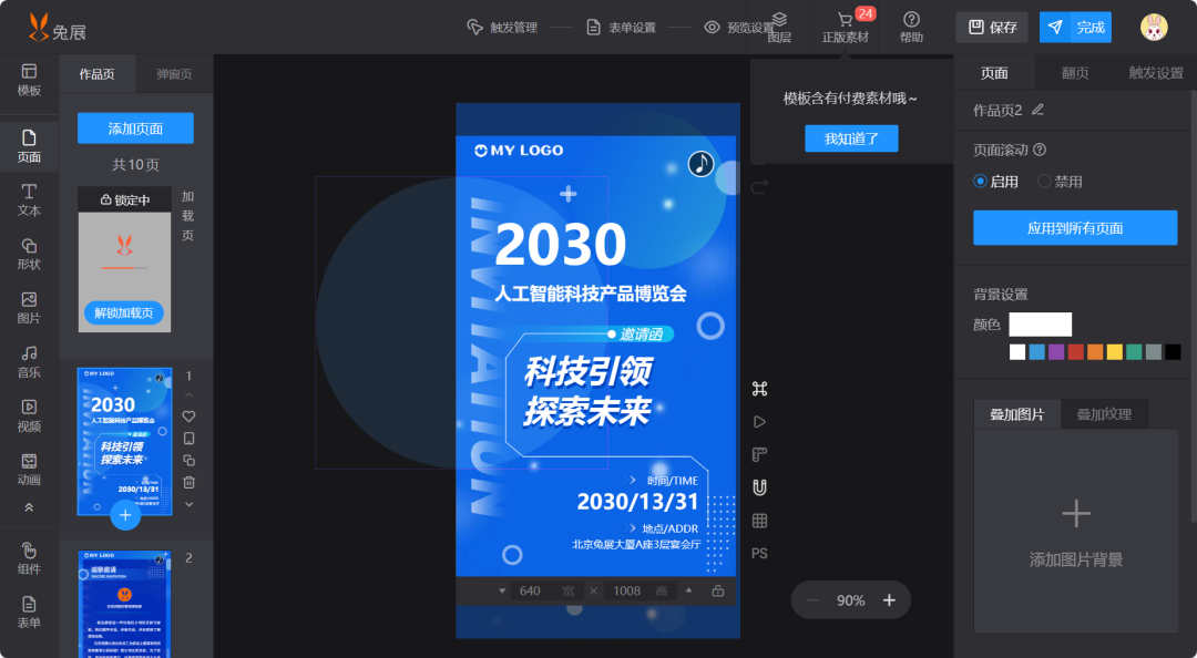 兔展是一款功能强大的H5制作工具,提供了大量精美的模板,支持自由拖拽设计,而且操作简单,非常适合新手用户。