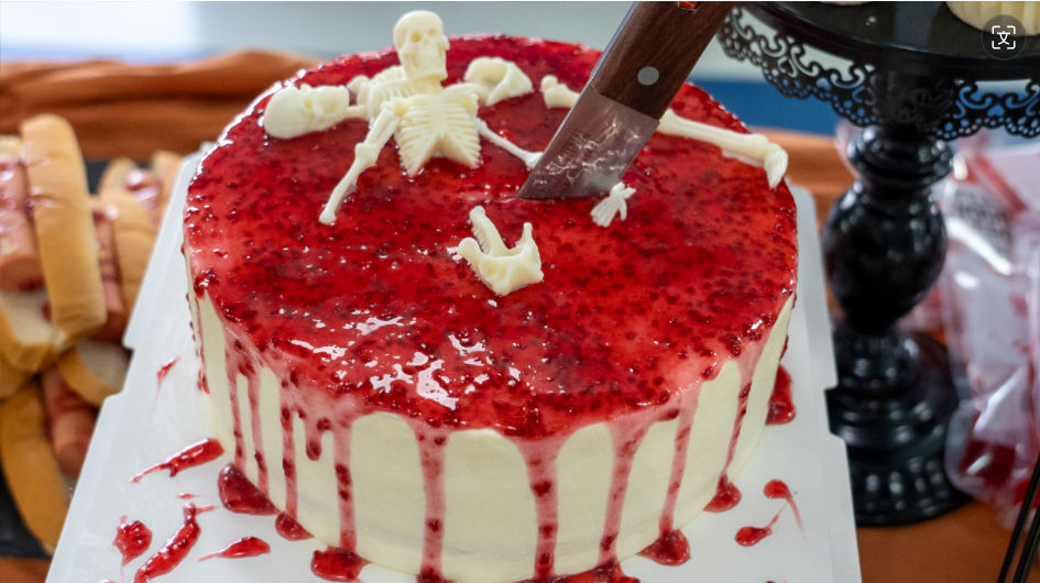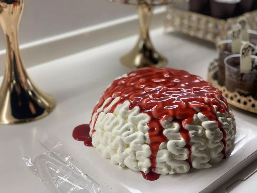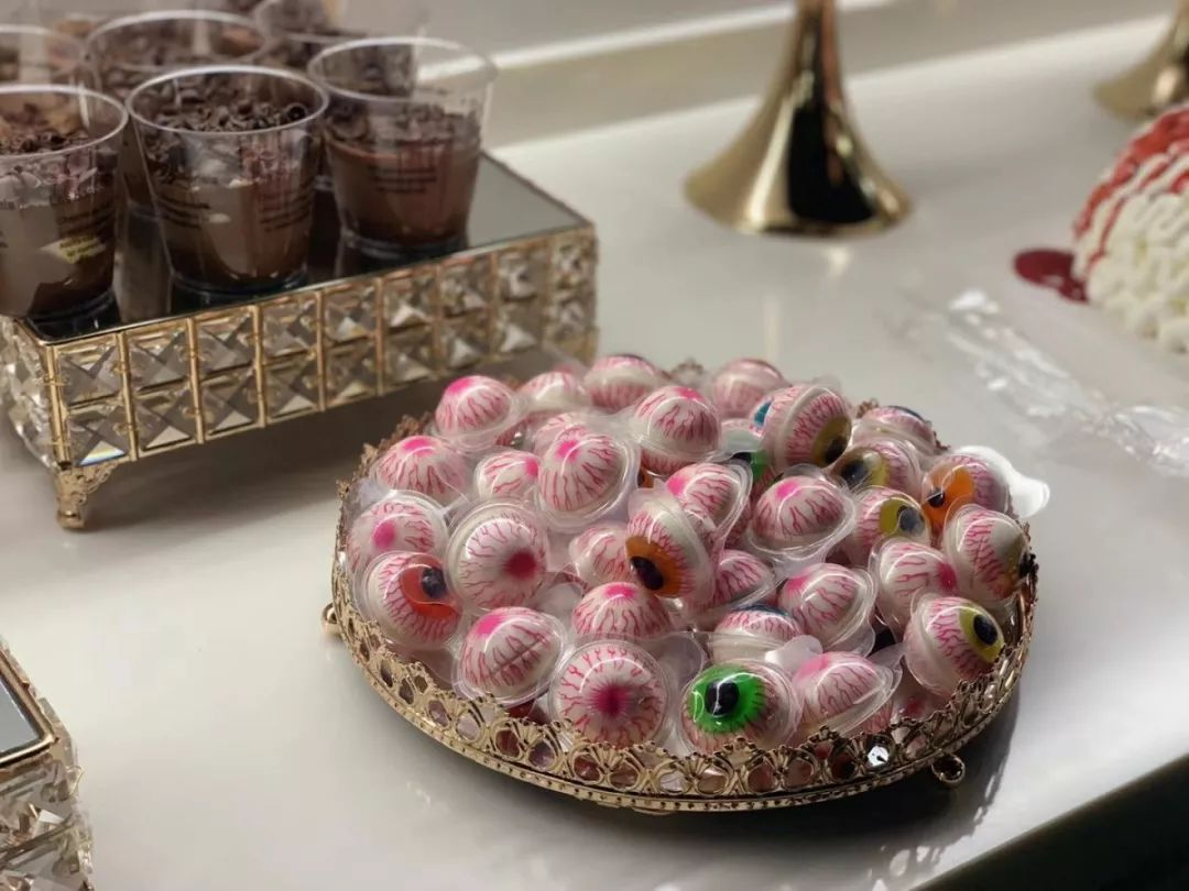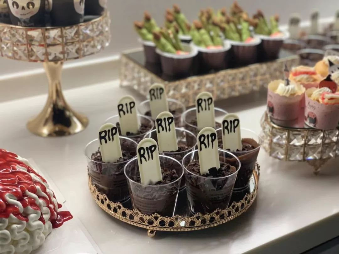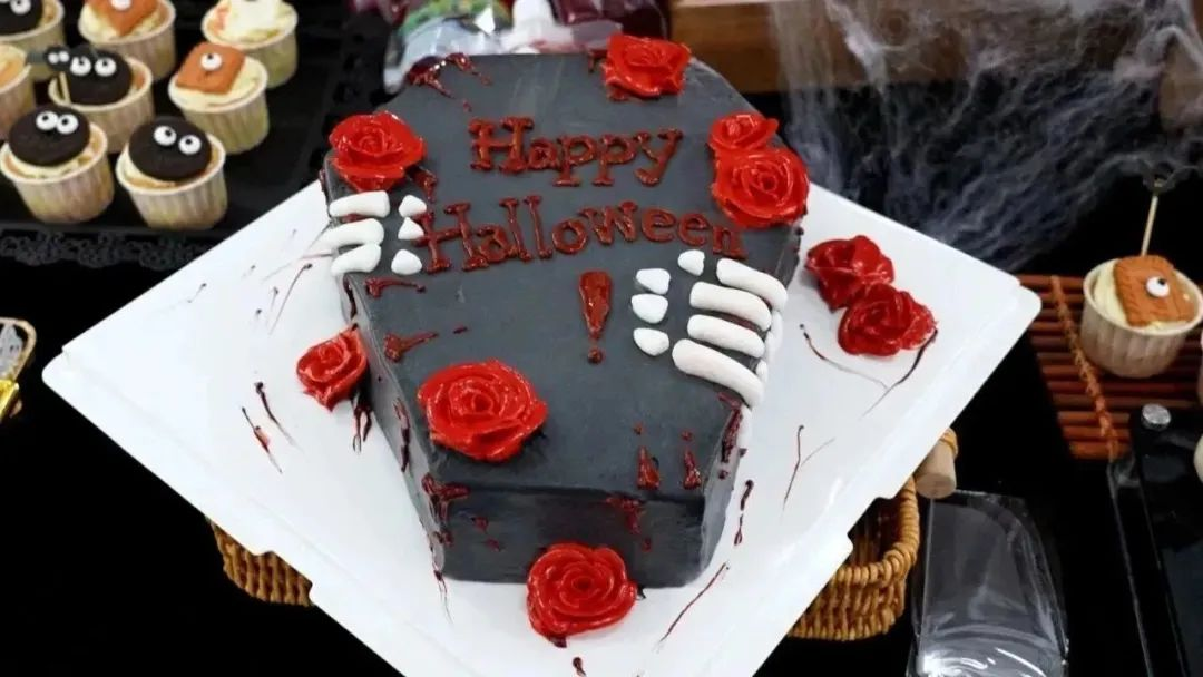 例如将蛋糕甜品、零食、糖果设计成棺材、犯罪现场、脑浆、墓碑、眼球、小怪物的样子。