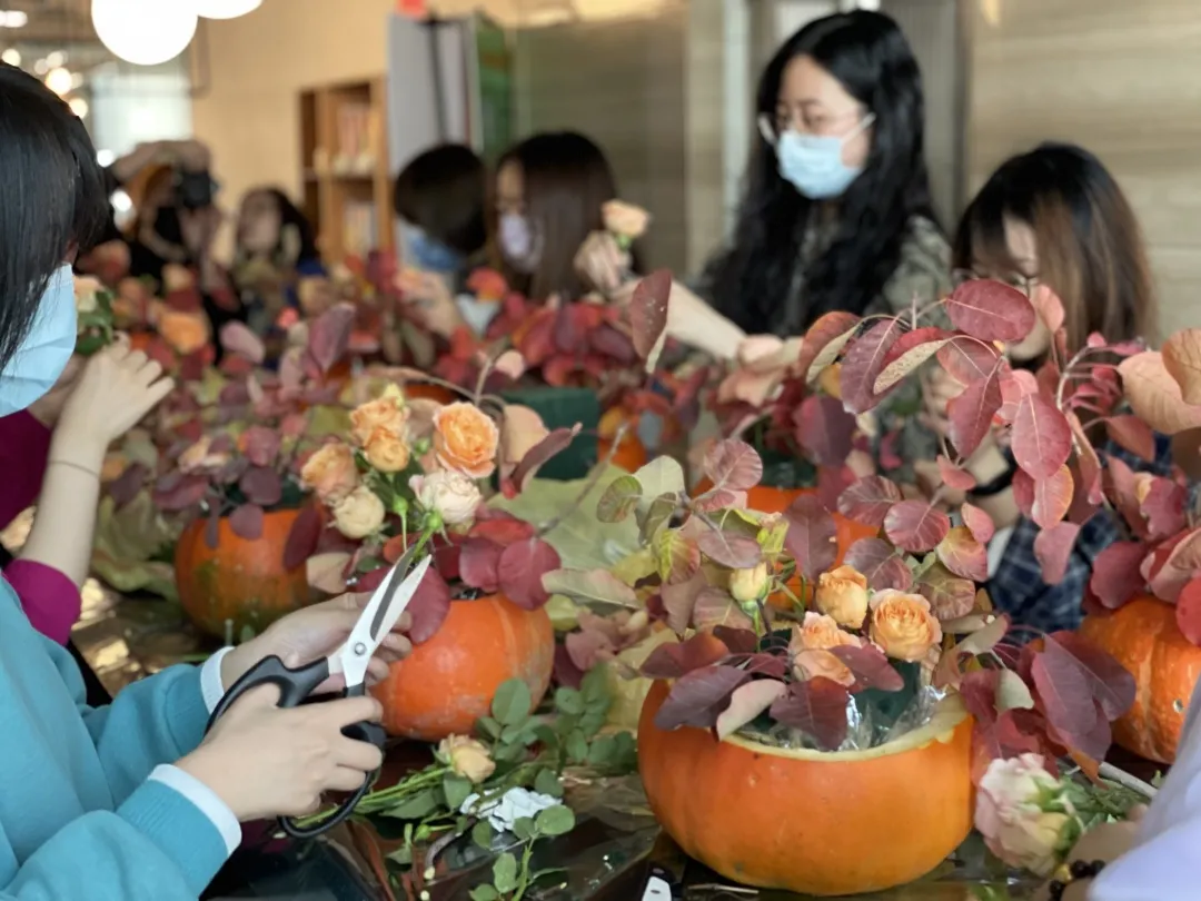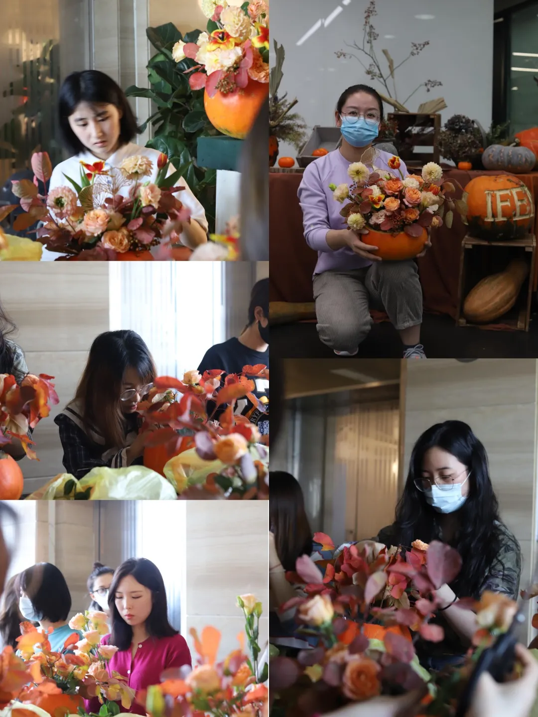 凤凰网则是给员工们安排了DIY插花,以南瓜作为花器,加入花材,制作一个iFENG专属回忆花艺。