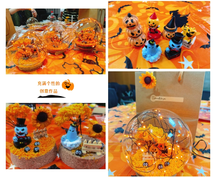 万圣节除了那种刺激运动量较大的游戏互动,我们也可以选择让员工安静坐下来做做手工。譬如昆仑万物公司往年万圣节做过DIY南瓜水晶灯的活动,制作出来的作品有趣且精美。