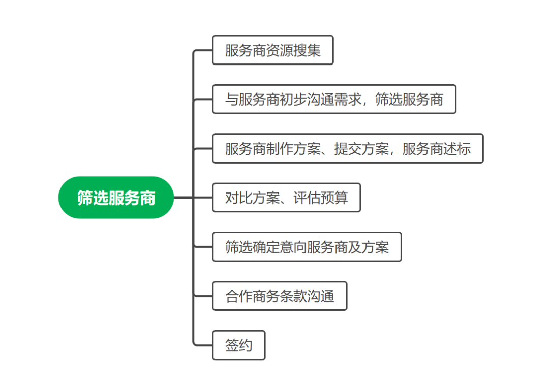 第二步是筛选服务商,行政可以通过介绍、平台等渠道去先搜集服务商,然后对服务商和其方案进行筛选,选定最适合企业的签订合同。