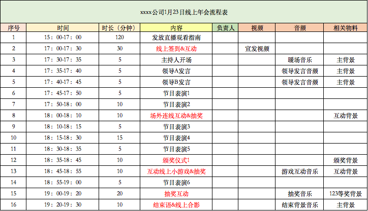 最好是专门做一个活动执行手册,内容包括:分工表、流程表、场地规划图、物料清单、场地安排、采访时间安排、第三方人员管理、VIP名单、桌卡名单及座位排序等详细内容。