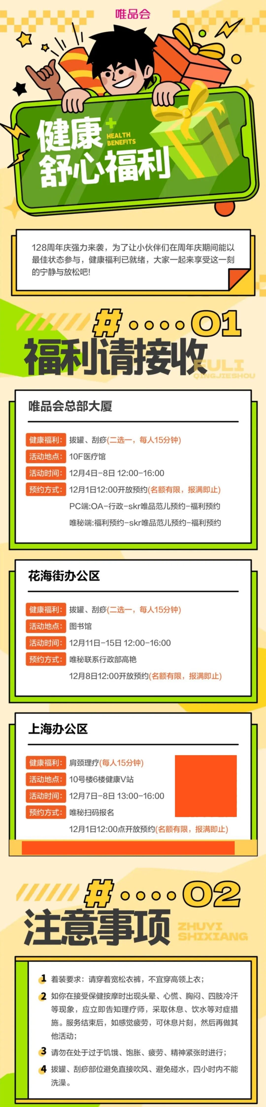 唯品会为了给员工开启最佳状态,特地给不同办公区准备了相应的健康舒心福利——拔罐、刮痧、肩颈理疗等。