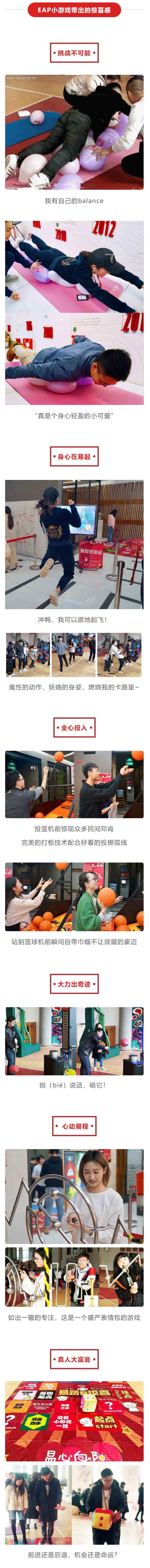 再如网易曾经借“EAP员工帮助计划”组织了一场轻团建,特地组织了不少EAP小游戏,如挑战身体平衡、燃烧卡路里的动作PK、投篮机投篮、砸锤子、穿越火线电动迷宫、真人大富翁游戏等等,有趣还特别解压~