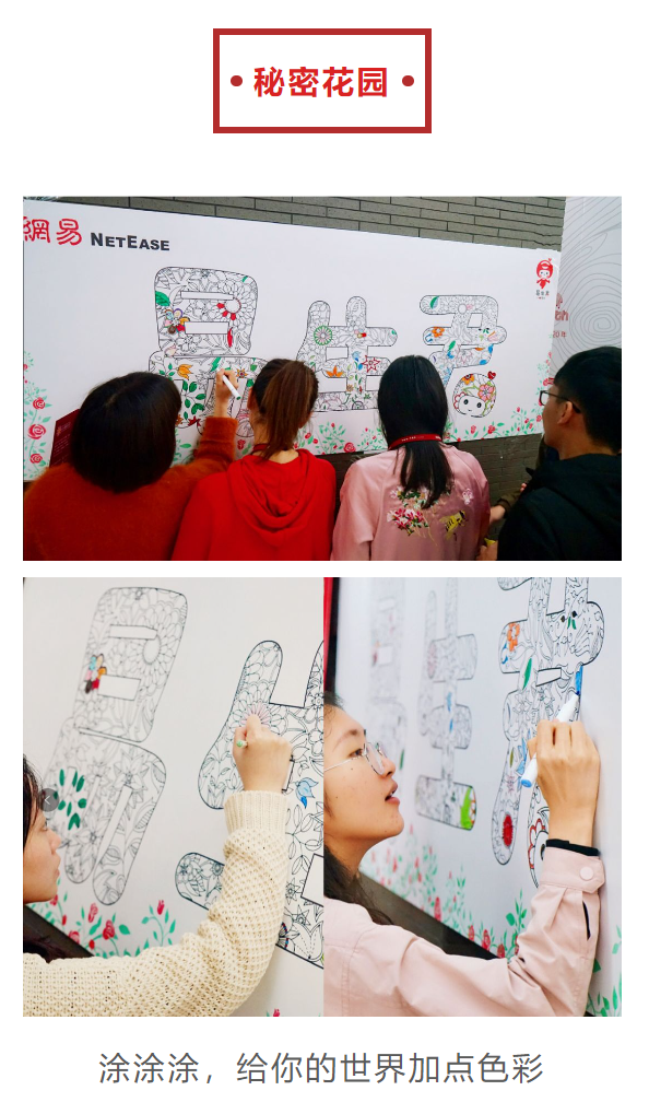 网易在举行EAP活动时,特别准备了“幸福涂鸦”和“秘密花园”两个小活动,大家可以静下心来,专注在给石膏娃娃涂色,或是在墙上尽情创作,惬意放松,宁静享受。