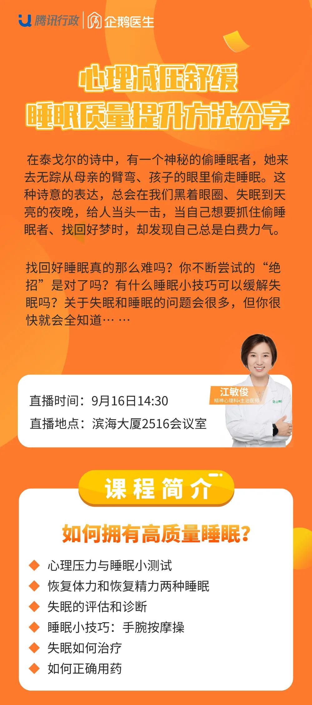 例如腾讯公司就曾为员工开通了心理减压舒缓和提升睡眠质量的免费直播课,帮助员工们舒缓压力、更好地休息。更有国家认证心理咨询师1对1心理疏导。