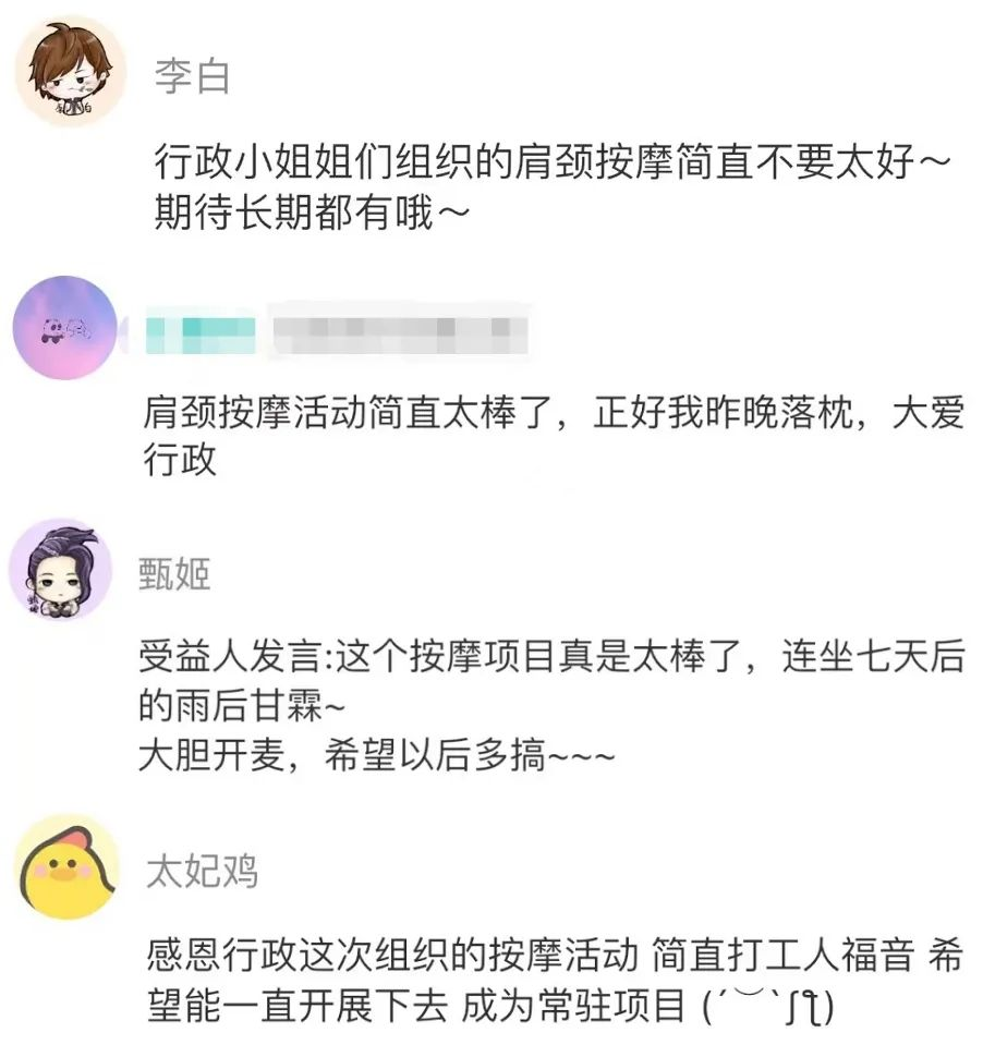 之后还陆续开展为期两个月的按摩活动,让员工保持更好的状态+满满的活力投入工作。员工们也是表示十分满意。