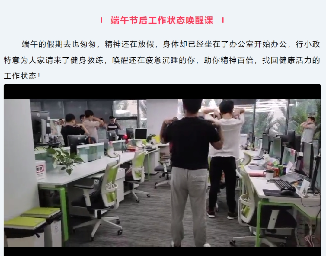 小猪民宿为了帮节后回到岗位的员工们找回活力,特地请了健身教练,在办公区直接带着大家活动健身,舒展身体,找回活力的工作状态。