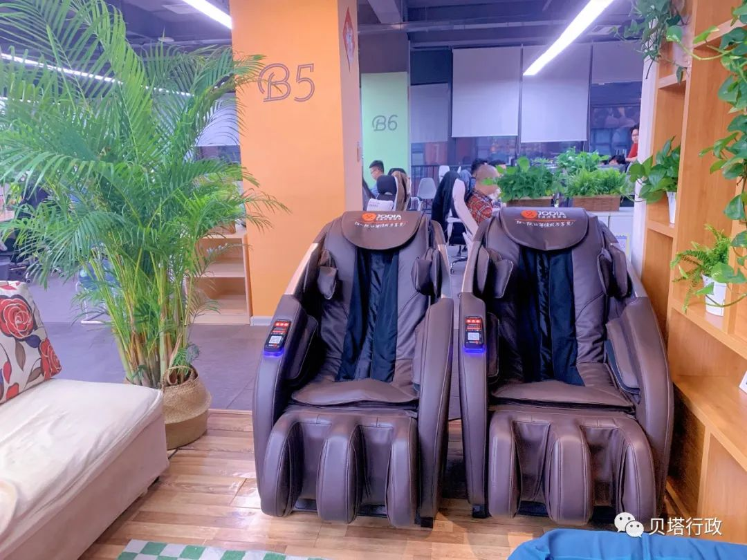 对于没有太多空间的公司来说,也可以参考贝塔公司的做法,他们就在大休闲区配置了2台按摩椅,休息时间员工可自行扫码享用,让上班紧绷的身体放松一下~