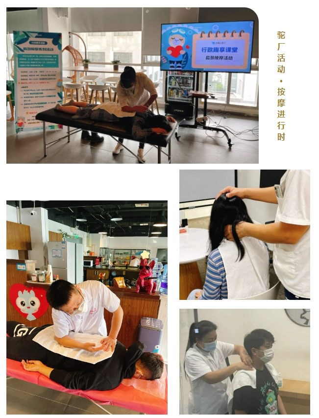 关注并提升员工心理和生理健康,也可以帮助构建积极的工作环境,行政可安排专业人员给员工做理疗、按摩,帮助员工维持或恢复更好的工作状态~