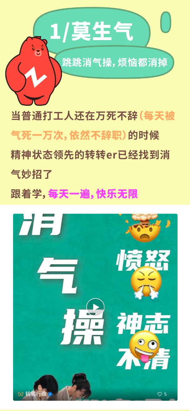 例如转转前段时间就组织了一场“拒绝精神内耗,有事直接跳操”的小活动,带领大家学习“消气操”,每天一遍,快乐无限,此外,员工还可以在相应文章下评论点赞,达到一定数量即可领取肩上萌宠。