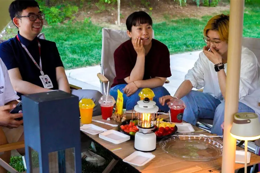 最近甘李集团也在自家的文体楼打造了一个“秘密花园”,一处冬暖夏凉的休憩基地,员工可以在此休息娱乐、品茶饮、打卡拍照等,让打工人暂时远离班味,享受露营休闲氛围。