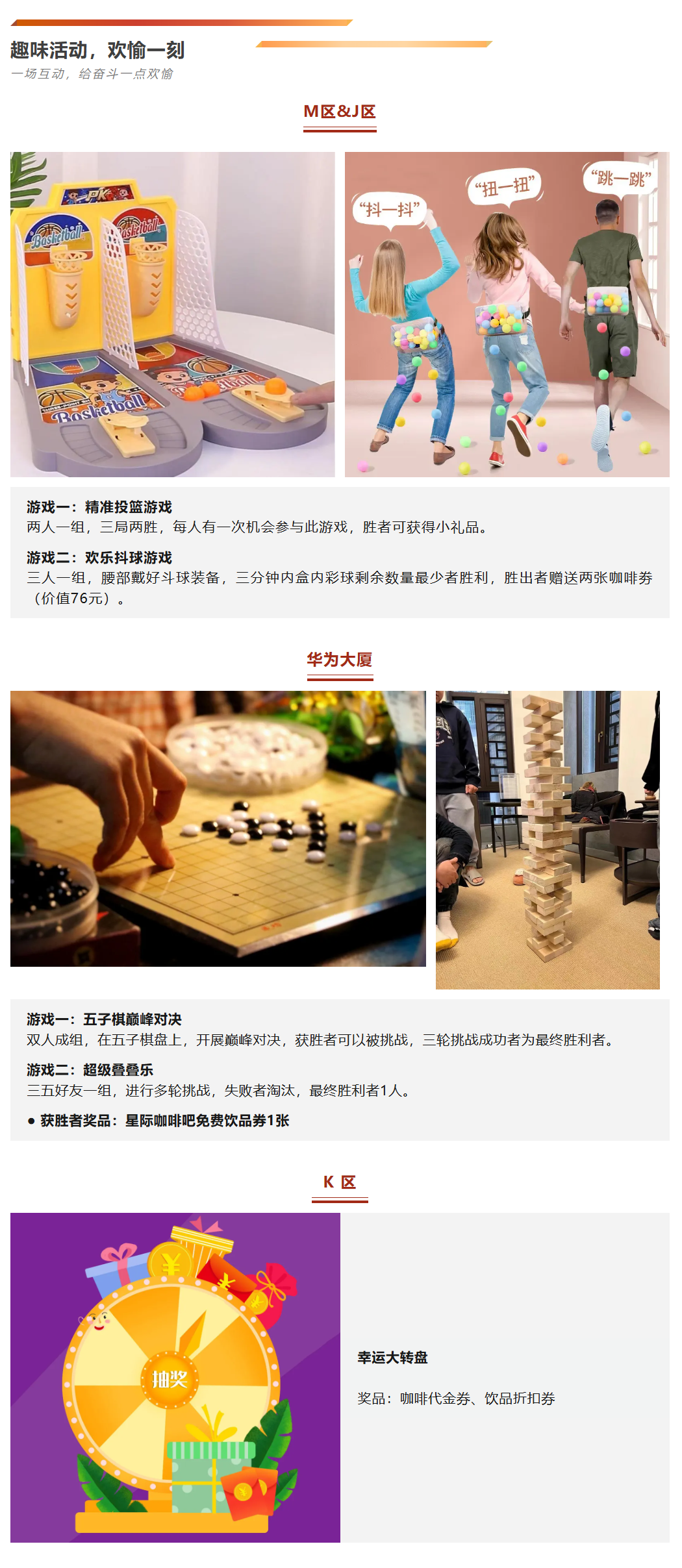 华为北京办公区曾在下午茶时间组织了轻松一刻的轻团建,大家可以参加各类游戏如精准投篮游戏、欢乐斗球游戏、五子棋对决、超级叠叠乐以及幸运大转盘等,通过一些有趣的活动,帮助大家增添活力。