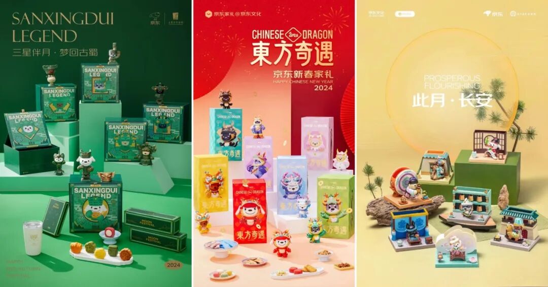今年中秋节京东还与三星堆博物馆联名,把DOGA家族公仔分别与青铜大力人、一号青铜神树、青铜神鸟等三星堆文物结合,打造了一套极具文化特色的中秋礼盒。
