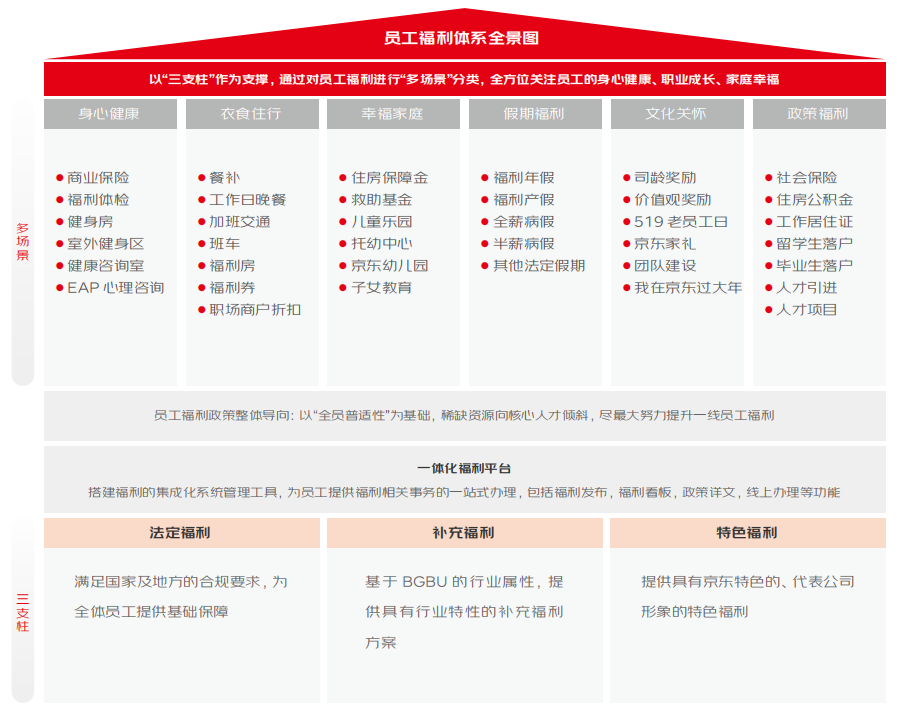 经过十多年的积累和迭代,京东形成了现在包含身心健康、衣食住行、幸福家庭、假期福利、文化关怀、政策福利六大场景的福利体系,为员工提供全方位的福利保障。