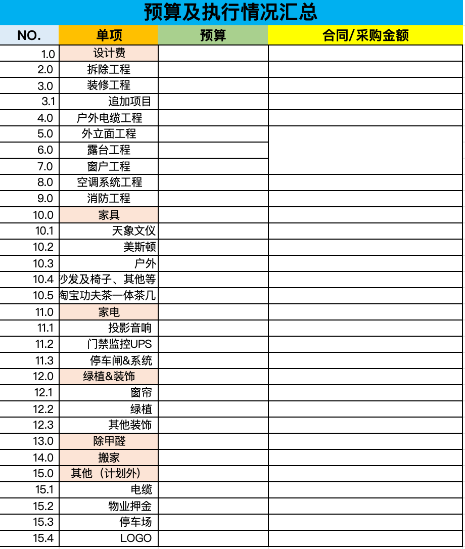 当然,装修过程中,还有一项很重要的工作,那就是控制成本,还要做好预算和执行情况的汇总。