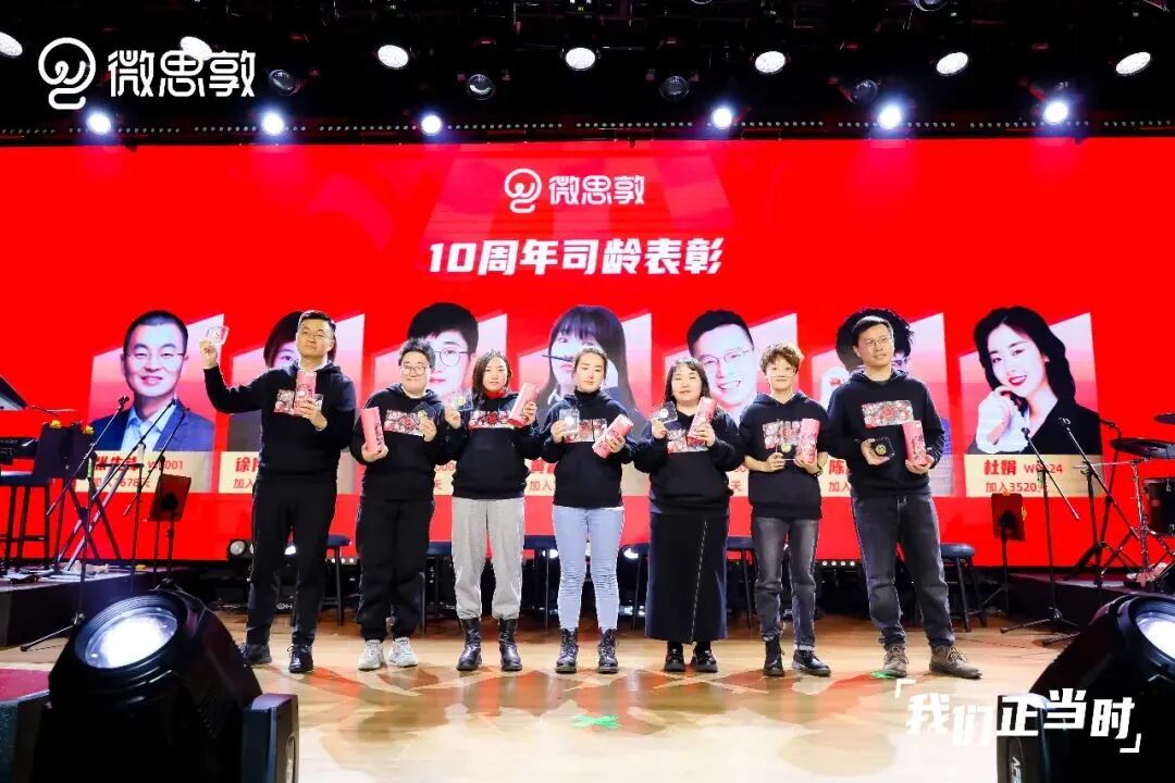 年会上,除了必备的年度表彰环节,还对在公司满10年的员工进行了10周年司龄表彰,授予他们50g 足金纪念币和司龄T恤。