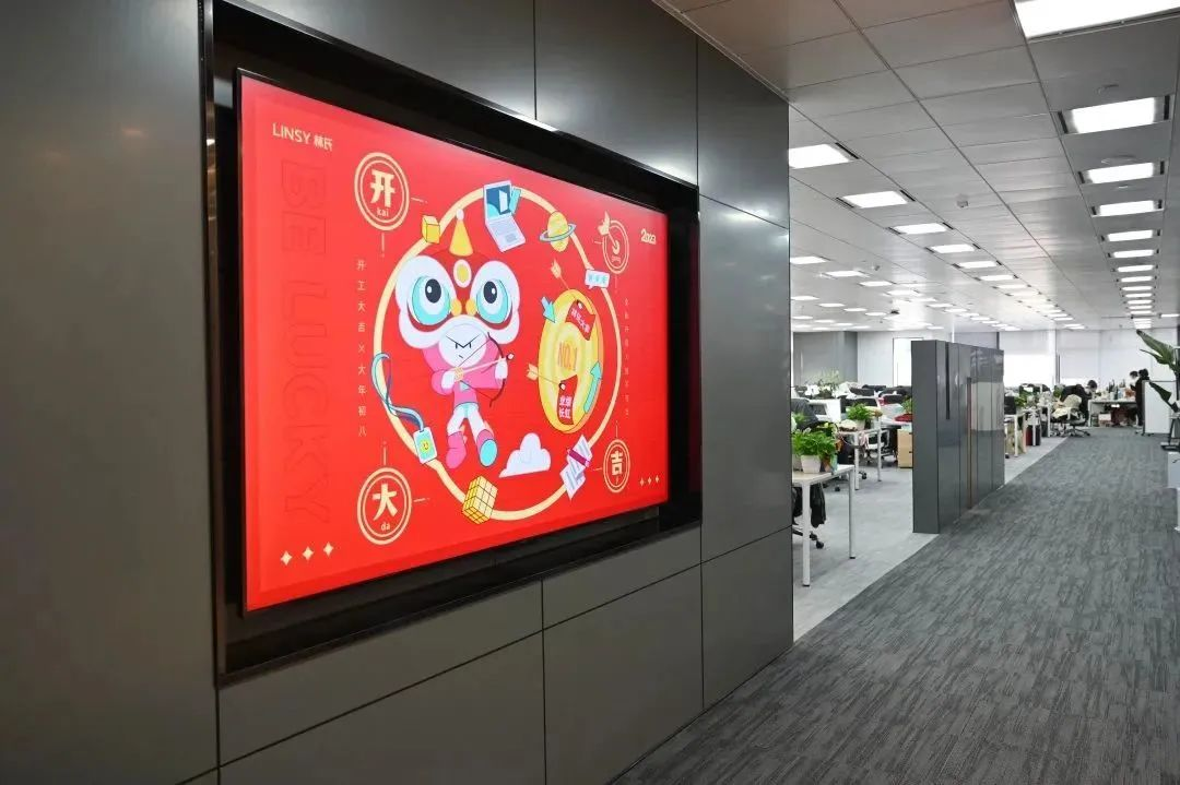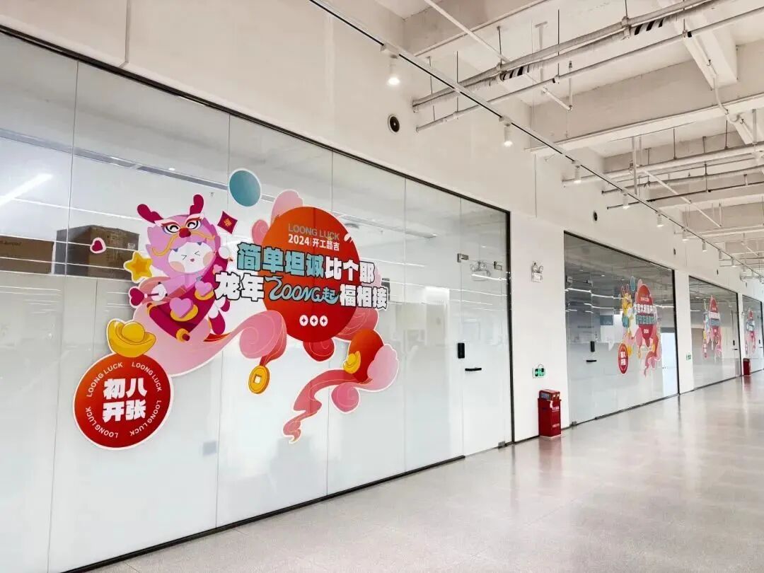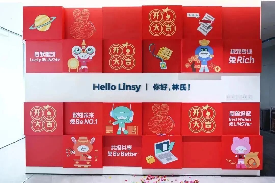 林氏木业各地工区焕然一新,前台、文化墙、电梯间、职场玻璃墙上都装点了新年元素,迎接员工的到来。