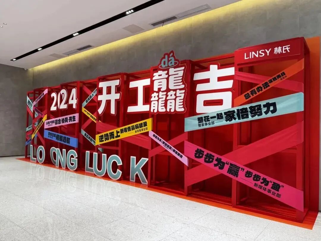 还可以暂时将文化墙进行改造,营造开工氛围,比如林氏木业在兔年时,将文化墙与开工结合!
