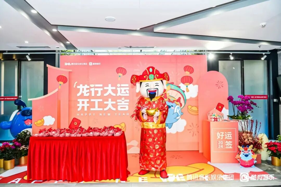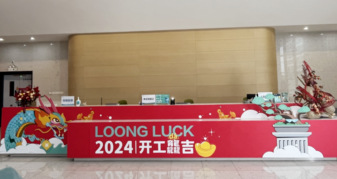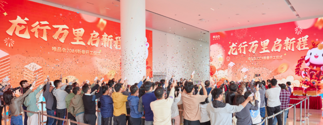 很多企业会在开工当天布置一面背景墙,通常上面以开工为主题作为主视觉,并结合当年的生肖元素,比如酷狗开工仪式上以“龙行大运,开工大吉”为主题,唯品会以“龙行万里启新程”为主题: