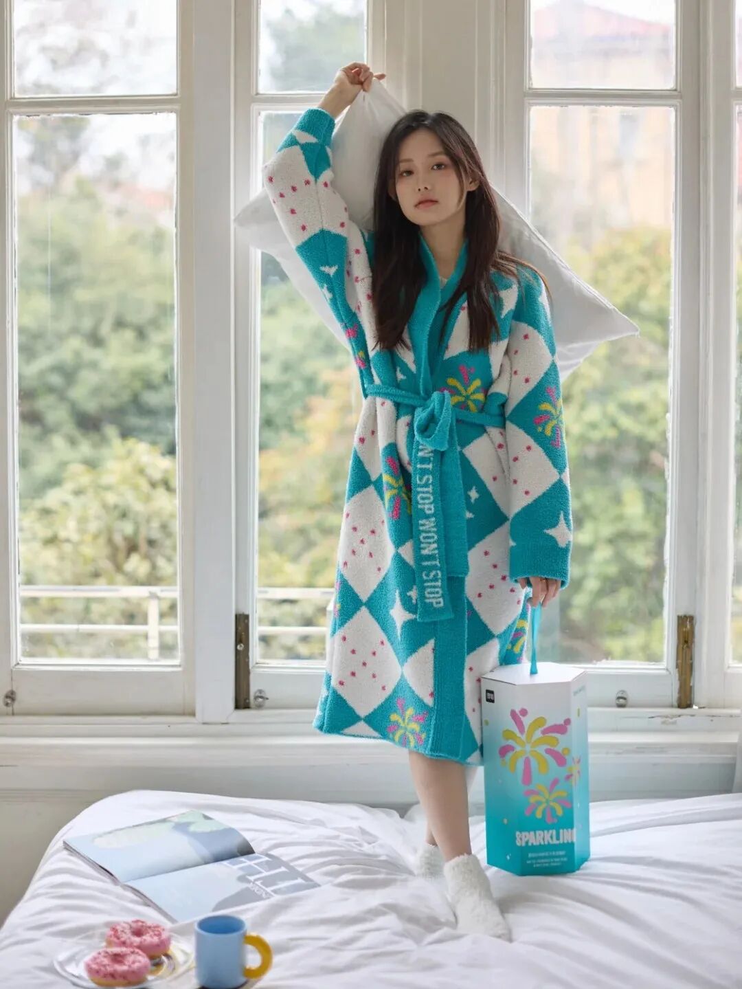 高级感睡衣套装精选高织密半边绒材质,触感如云朵般轻盈,软fufu 糯叽叽。剪裁简约却不失设计感,腰间点缀的细闪丝带与「SPARKING」主题呼应,穿上即是自带光芒的慵懒女神