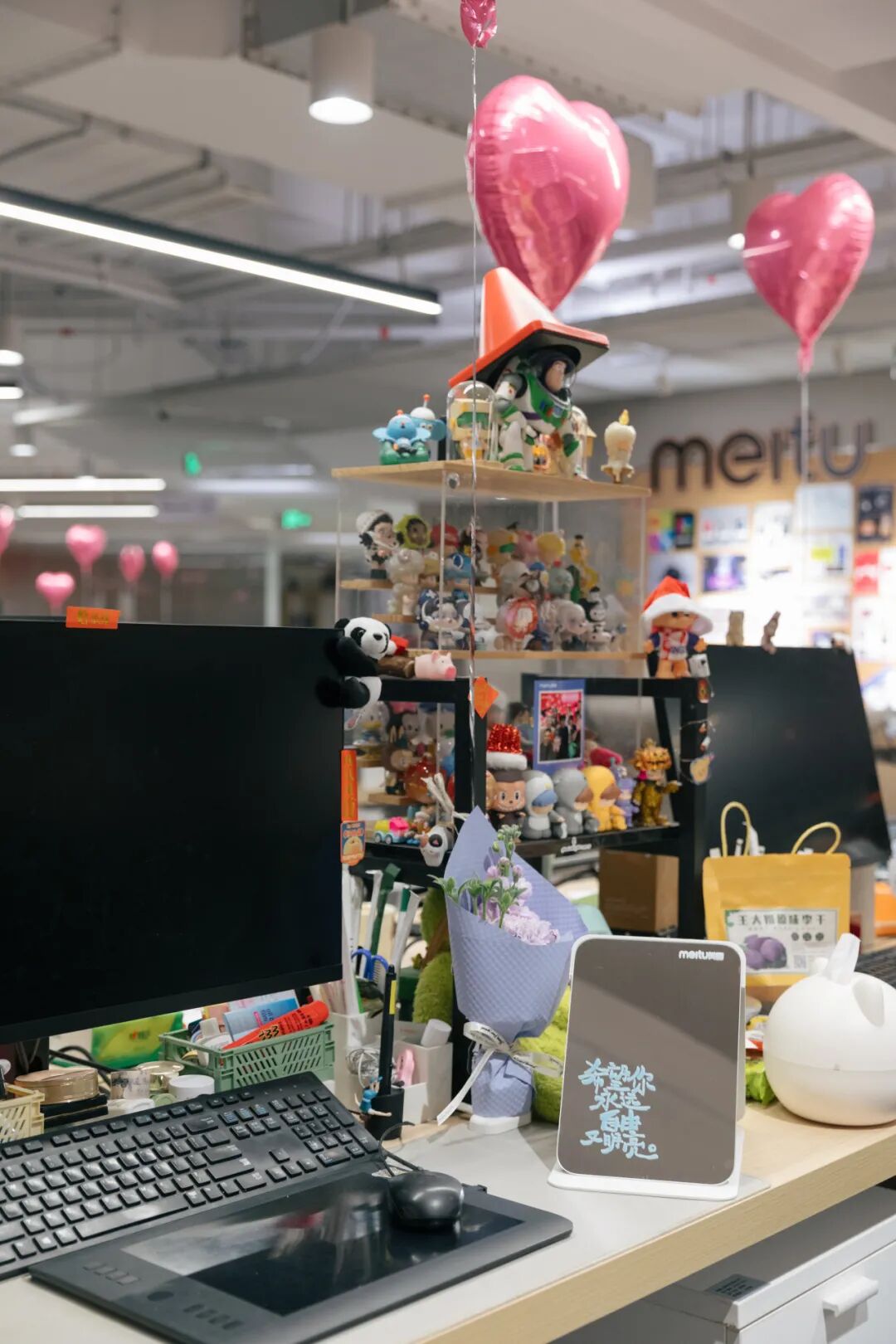 除了礼物,益乐还准备了其他惊喜。用气球花装饰了公司,Fafa背景墙、玫瑰fafa、爱心fafa,还有一束束精致的fafa花束。益乐女神们在充满氛围感的气球花束墙下打卡,各个摆出“方圆百里我最美”的姿态,一组组甜飒美照出炉。