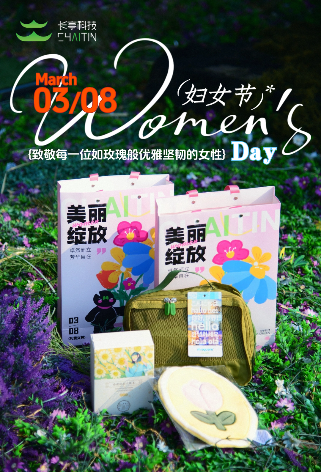 卓然自立,芳华自在。今年妇女节,长亭科技为公司女士们准备的礼物以实用为主,内含:msquare旅行收纳袋(五件套)、珍视明蒸汽眼罩(十贴)、花朵洗手巾(图案随机)。