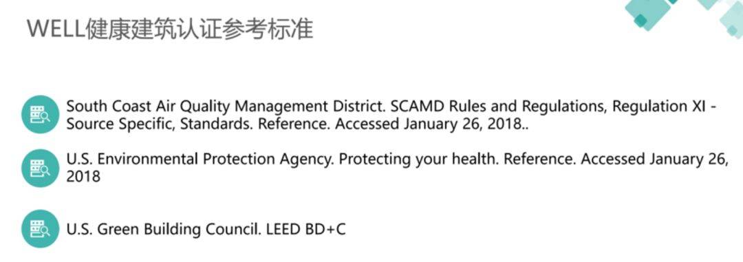 *WELL健康建筑认证参考3个标准,即南海岸空气质量管理区标准、美国环境保护局标准、美国健康建筑委员会标准。