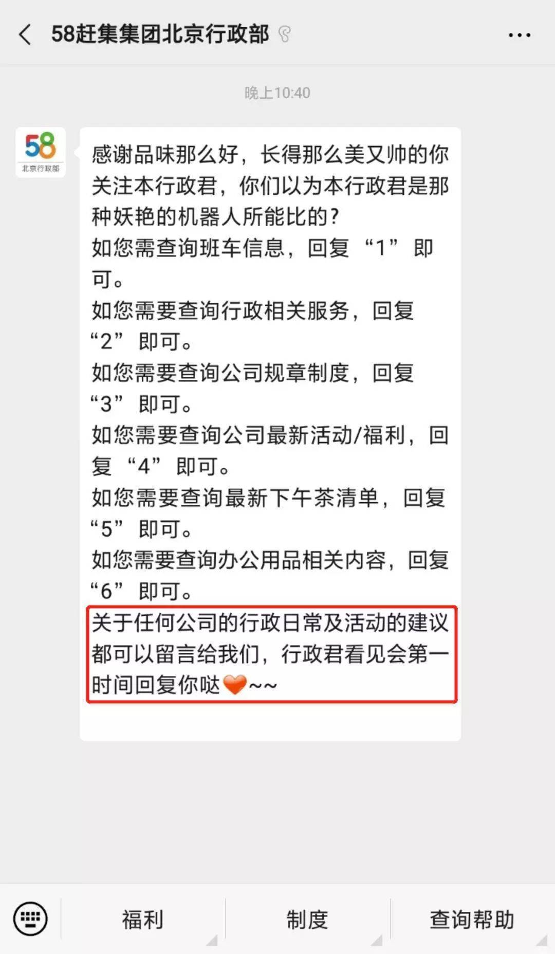 行政er可以利用「新关注回复」或「菜单栏」功能,鼓励员工建言献策;还可以利用「推送」功能,对多数员工的痛点问题进行集中处理,给予正面回应。通过公众号这个窗口,建立行政亲和力及影响力~