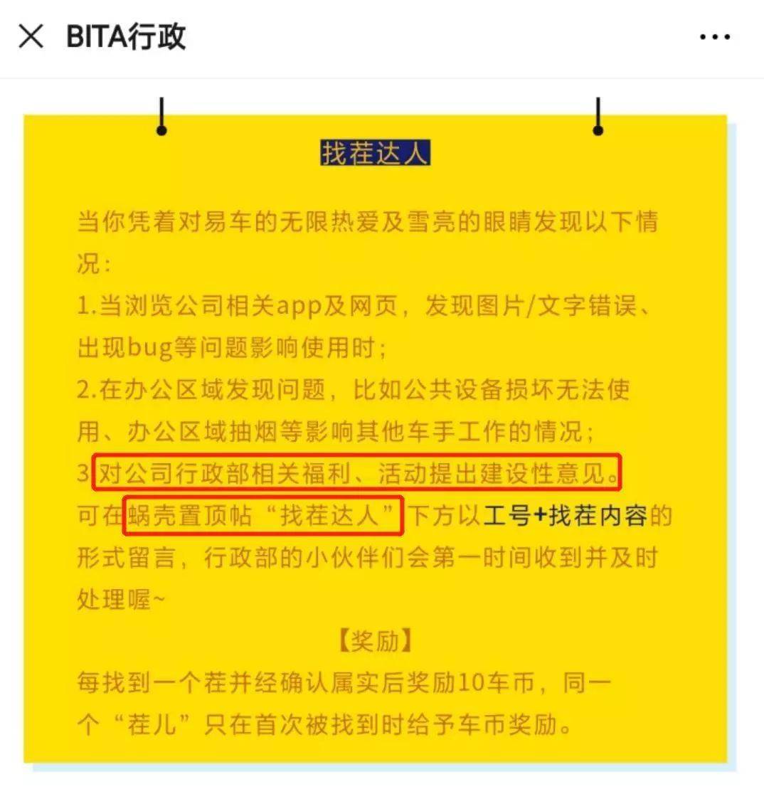 比如,易车网的行政er在蜗壳工具上,创建了「找茬达人」的意见征集帖。员工发布「找茬内容」,行政小伙伴们不仅会及时回复、处理,还会给符合条件的「茬儿」颁发奖励。