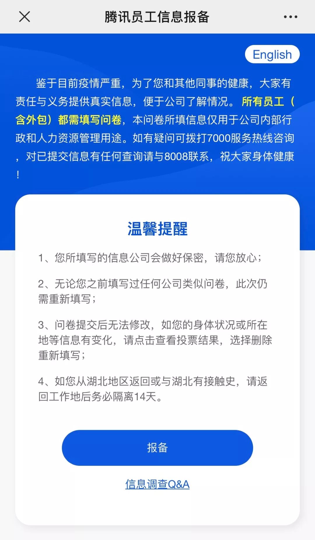 腾讯异地办公变休息:为了保障员工安全,将原定2月3-9日为在家办公日,后统一改为休息日。并赶在开工前启动第二次全员信息报备,以备掌控信息隔离隐患。