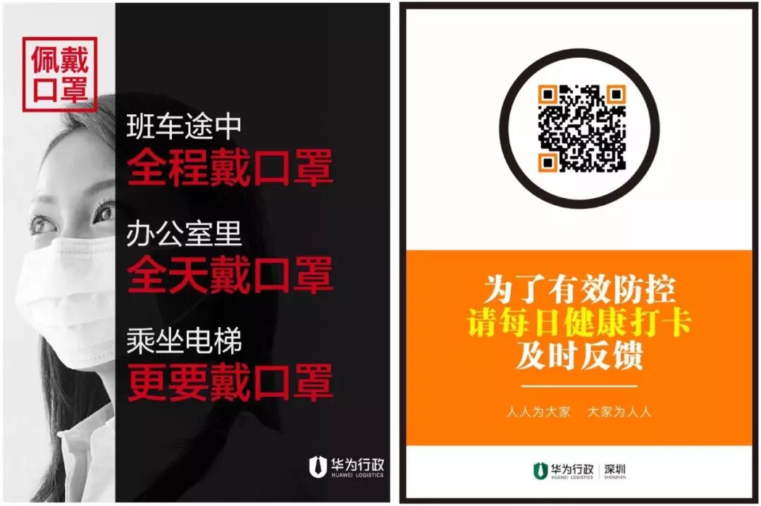 华为提前全面消杀:1月23日前便已启动全面消杀机制,并要求员工全天候佩戴口罩,只在吃饭那一刻才可以摘下口罩。同时要求每个员工每日进行健康打卡反馈信息。