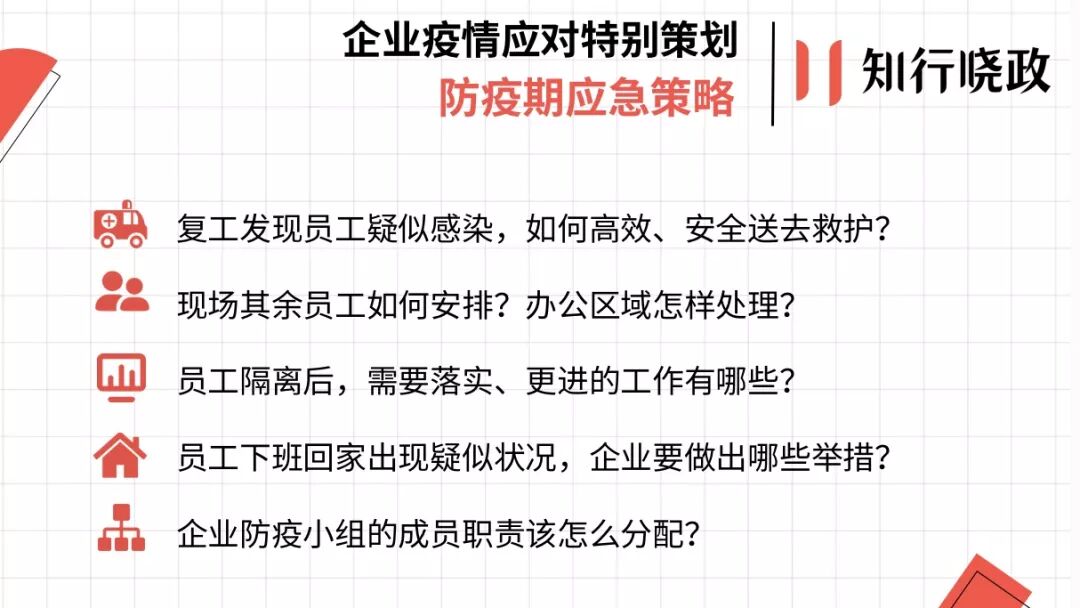 「企业出现疑似病例该怎么办?——防疫期应急策略」,是知行晓政针对行政如何做好病毒防护,制作的|企业疫情应对特别策划|小课堂中的第二个分享话题。