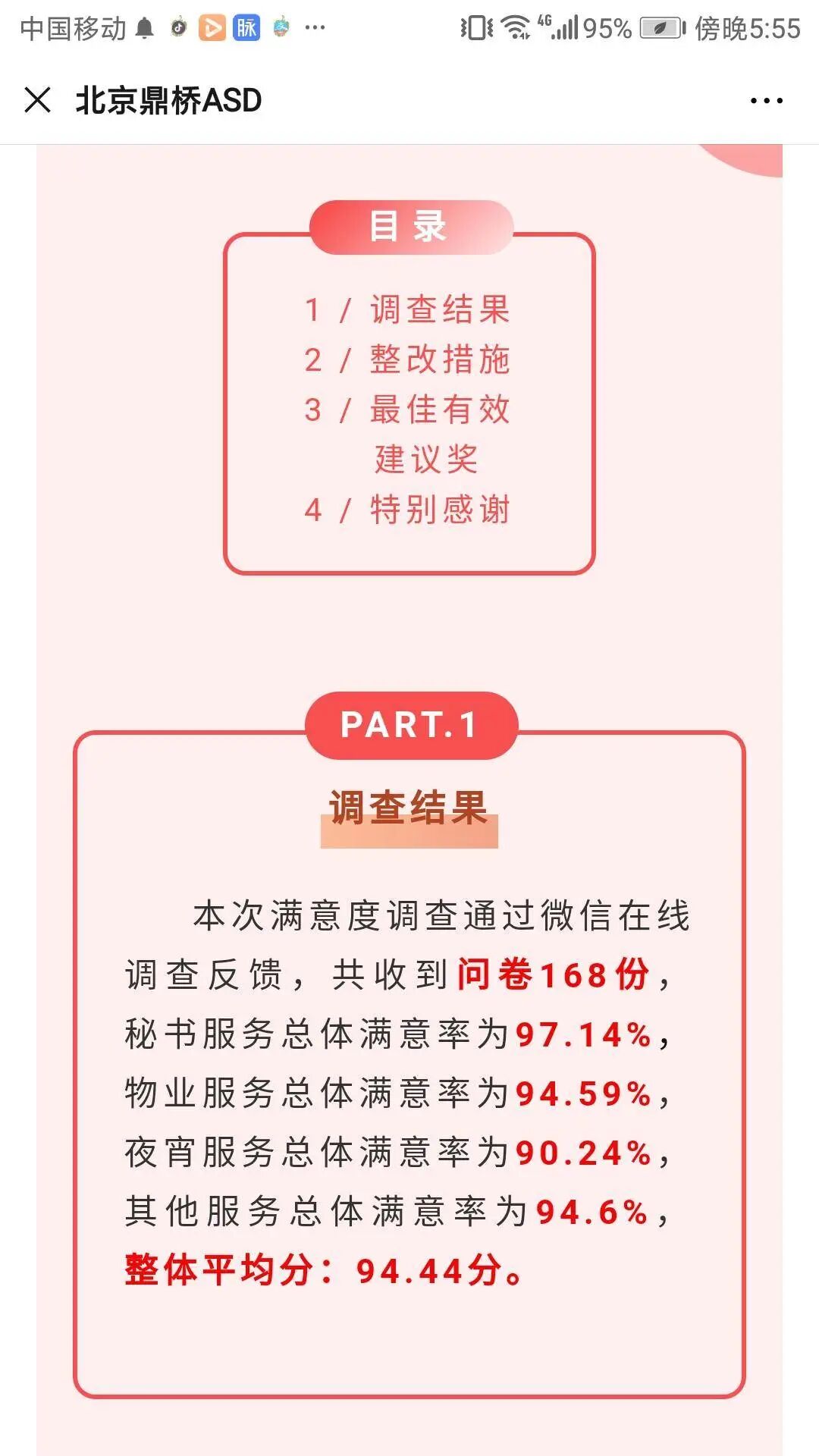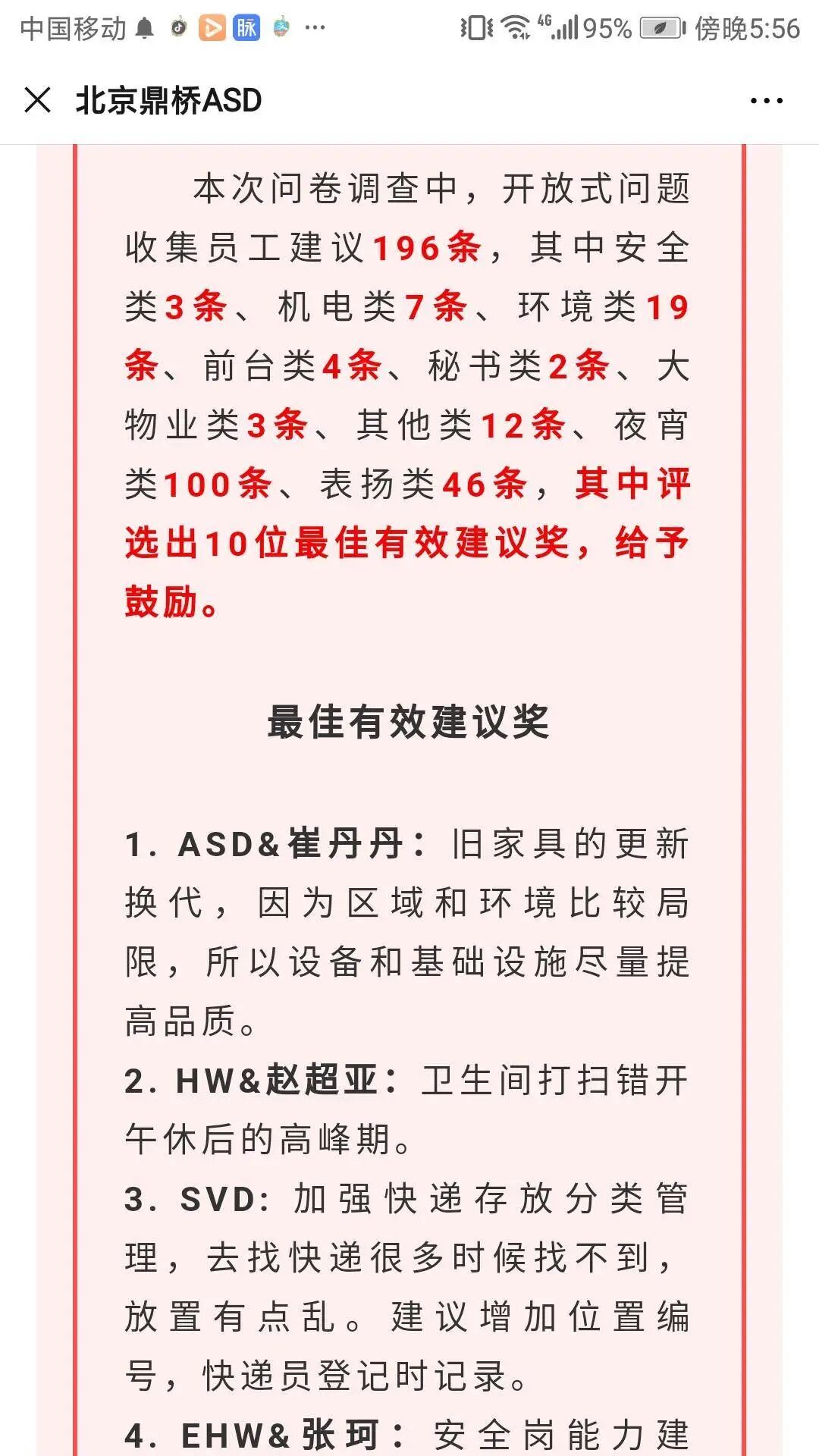 而北京鼎桥ASD也在调研结束后,同步了调查报告。报告中,既包含了结果概况(报告回收情况、分模块满意率等),又对提出可行性建议的员工进行了公开表扬。提升了用户的参与感与集体归属感。