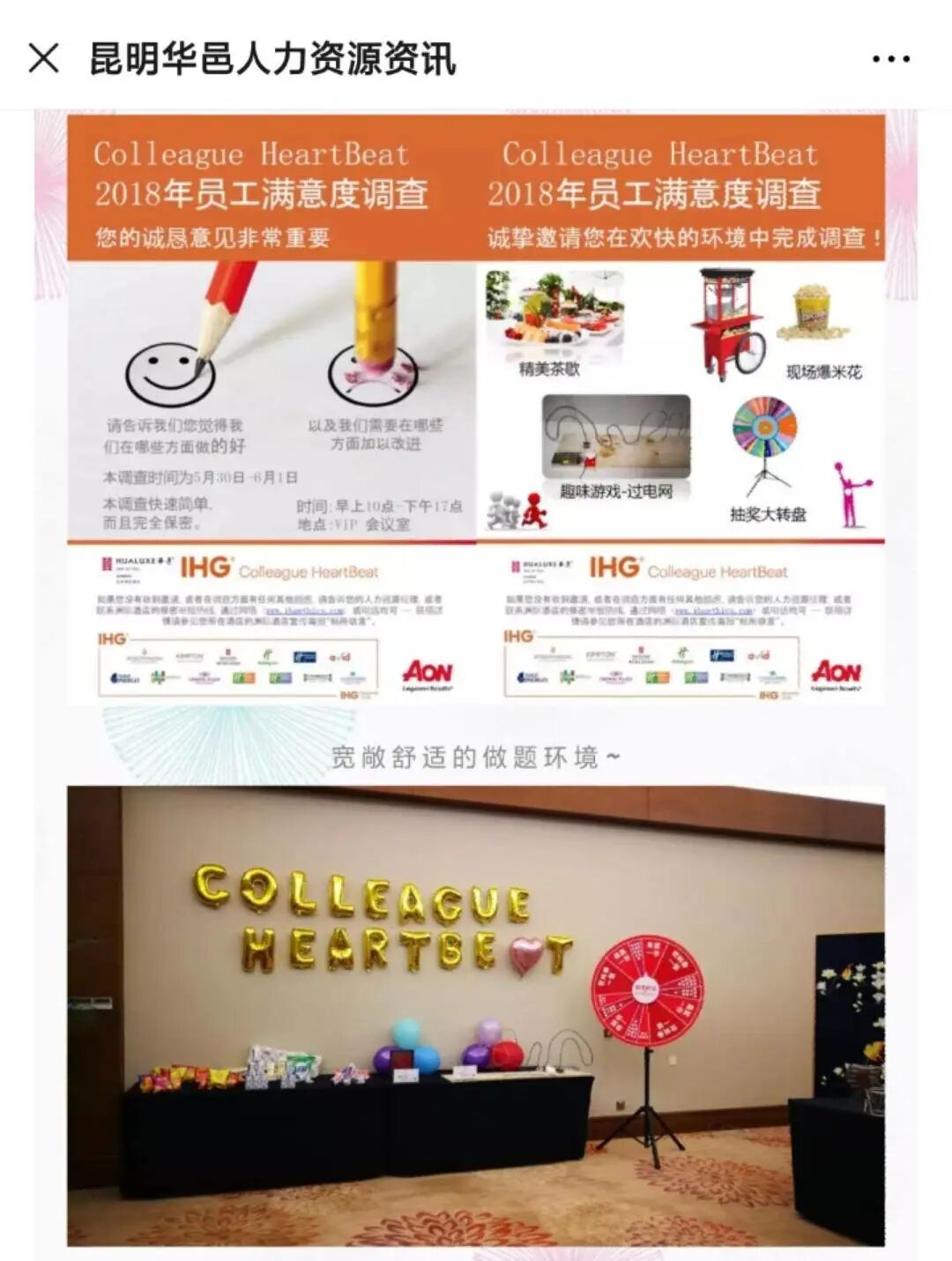 ◎ 组织穿插调研的活动:虽然费用用高,耗时长,但可以创造自由公开、零距离的线下表达环境,帮助员工敞开心扉。例如,昆明华邑在2018年员工满意度调查时,准备了精美茶歇、趣味游戏与抽奖环节,赋予员工宽松舒适的调研环境,让员工能更好地回答问题。