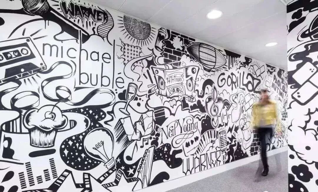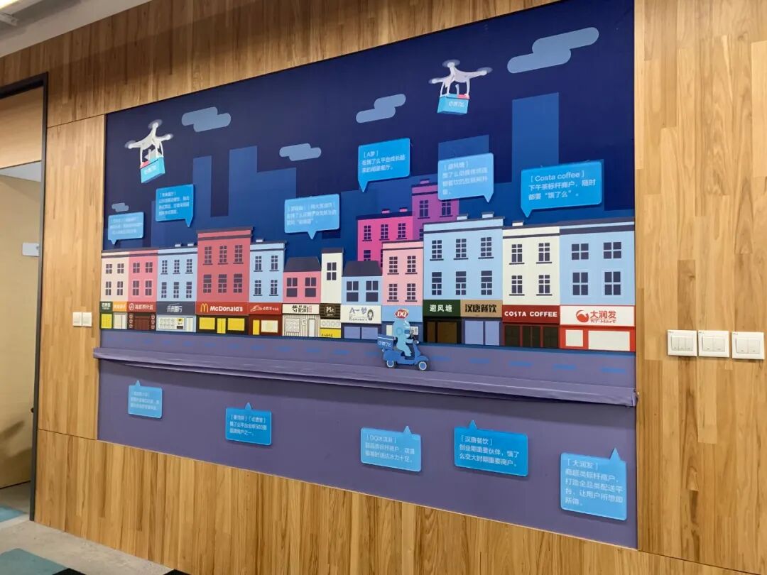饿了么把他们扩张到的每一个城市都做成一个「城市据点方块」,并用之组成了企业logo图案。既展示了壮阔的发展成果,又通过一个个具象的城市小方块,把发展历程清晰地呈现在眼前。以一条主线引导模式表现的发展历程,可以结合企业性质模拟一个真实场景。比如饿了么结合自己的外卖历程,制作街道场景,并设计了可以活动骑行向前的卡通骑手。即体现了外卖业务的主题,也能让观看者通过卡通人物的骑行,直观感受企业的发展,身临其境。还可以用手绘记录发展过程中的重要事项。比如云集由员工制作的超大发展历程手绘本,形象地描绘出发展过程,让企业文化与员工之间的联系更紧密,增强了员工归属感和荣誉感。把公司各个阶段的标志性产品展示出来也是很好的方法。产品是公司文化发展的最直接成果,合理布局能够使文化宣传更加有感染力。戴姆勒公司把1886年制造的第一辆汽车「奔驰一号」展示在公司里,还有墙上的标志、柜门编号等……这些细节之处,对这家公司来说,都是独一无二的情怀和精神支撑。小米北京总部的展览厅,既有新品展示、也保存着小米的历代产品。一座属于自己公司的「博物馆」,是底蕴的体现。用展品装饰文化墙,能收获意想不到的效果~↑ 小米展览厅中的展品-粉丝们用「小米」制作的手机模型这家汽车行业相关公司将汽车轮廓画在墙上,把自己经营的汽车零件贴在上面展示,非常有创意。阐释企业的价值观和文化,重点是让它产生潜移默化的感染力。比起强硬灌输式,轻松有趣的表达方式更让人感觉亲切,易于接受。特殊材质的运用可以打造出多元色彩、错落有致等这些特点,让内容更加立体,加深印象和氛围。比如乐高公司用乐高块拼起的这面标语墙,巧妙的万花筒设计,让观者站在各个角度可以发现不一样的文化标语。还可以采用组合方块拼接的方法。比如小红书这面字母版块组合墙,可以在需要的时候实现自由组合。当企业文化随着发展而有所变动和更替、或者想定期更新内容的时候,不必大动干戈就能搞定。采用装饰物展现的文化墙色彩丰富、具有艺术感,有利于打造一个共同的聚焦点。用色鲜艳大胆的涂鸦墙会带来视觉冲击。鲜艳的色彩和简单的线条可以充分表达出企业文化中年轻、灵动、充满激情与创造力的部分。黑白灰风格的涂鸦装饰可能性多样,可以适用于不同风格的内容。异形涂鸦作品比如企业logo图案、指纹、树木年轮等具有象征意义的图形也是很好选择。适当的留白,会使图案更加显眼。还可以在公司内选定合适的位置摆放与公司文化相关联的装饰画、雕塑作品或者手工艺术品。马蜂窝在天花板上使用了十分点睛的装饰物,视线下移,就能看见一面企业记事墙。把重点聚焦在中庭,不仅能提升公司的整体格调,还能够让人加深记忆。展示企业文化的关怀与温度,离不开和员工之间的互动。依托于休闲娱乐、记录日常、员工表彰等方式的文化墙,能够让员工主动参与到企业文化建设当中,建立归属感与荣誉感。比如,汽车之家安装了一面乐高墙,让员工可以通过拼乐高缓解工作压力,释放创造力。同城艺龙把时下热门的互动游戏与企业文化结合,打造了一面旅行棋游戏墙。让员工在放松大脑的同时,也能感受到企业文化的熏陶。除了以上游戏方式,还可以打造一面属于员工的文化墙,鼓励员工自己动手创作。这能让员工的积极性更高,增加归属感。