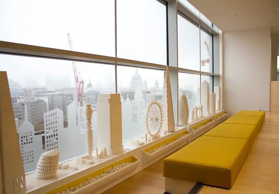 九楼是前台,可以接待访客、参观者,一进门,准能看到由乐高搭成的伦敦建筑模型。前台旁边是咖啡区域,巨大的落地窗也可以欣赏城市景色。