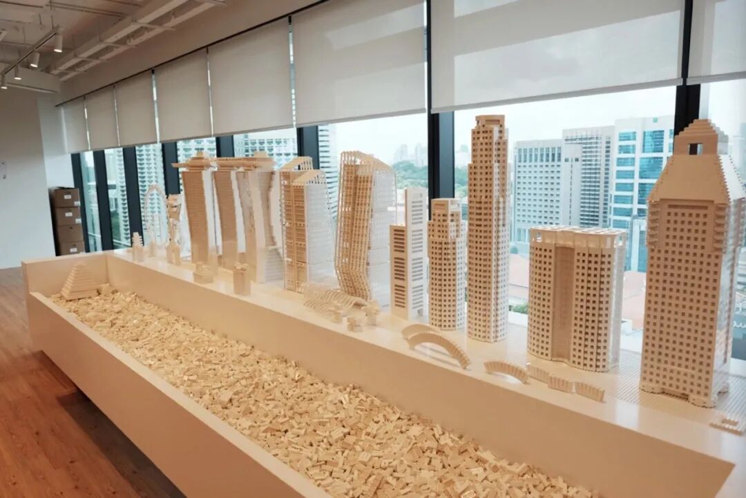办公室的顶部保留了白色的管道,有一种简约的工业风,前台旁边是用乐高标准积木拼成的新加坡地标和建筑,例如鱼尾狮、新加坡海湾金沙酒店等。