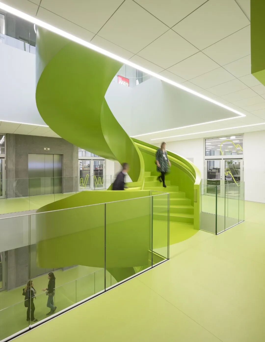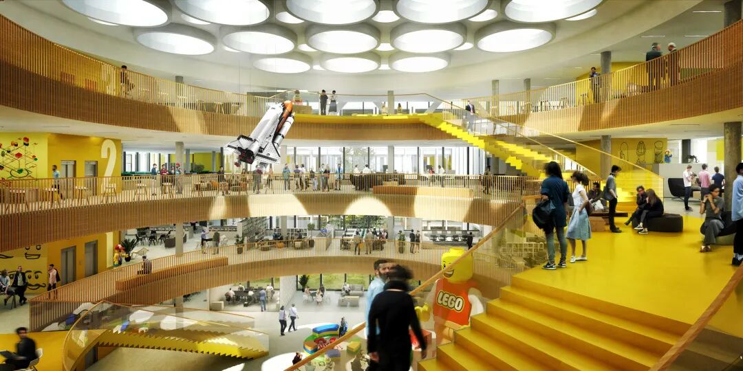 为了更高效地实现办公需求,乐高新办公大楼是完全开放。以中庭为核心,向四周延伸出去,蜿蜒的楼梯将园区的各个建筑连接起来。在各个建筑里穿梭,真的有种在巨型游乐场里玩乐一样。