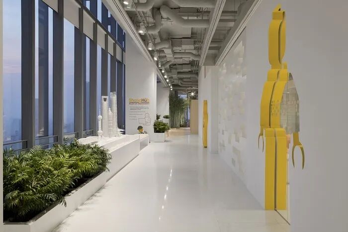 整个大楼主体四层楼高,顶部采用了乐高经典的明黄色,一整块搭在了楼顶,周围都设置有大面积落地玻璃窗,采光极好。