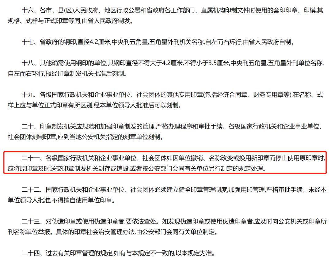 ◎ 印章注销:根据《国务院关于国家行政机关和企业事业单位社会团体印章管理的规定》要求,因单位撤销、名称改变或换用新印章而停止使用公章时,应及时送交印章制发机关封存或销毁,或按公安部会同有关部门另行制定的规定处理。