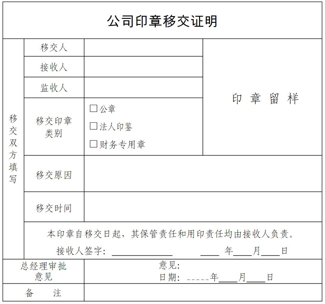 ◎ 印章移交:要及时办理移交手续,签署移交证明,同时变更相应记录信息。