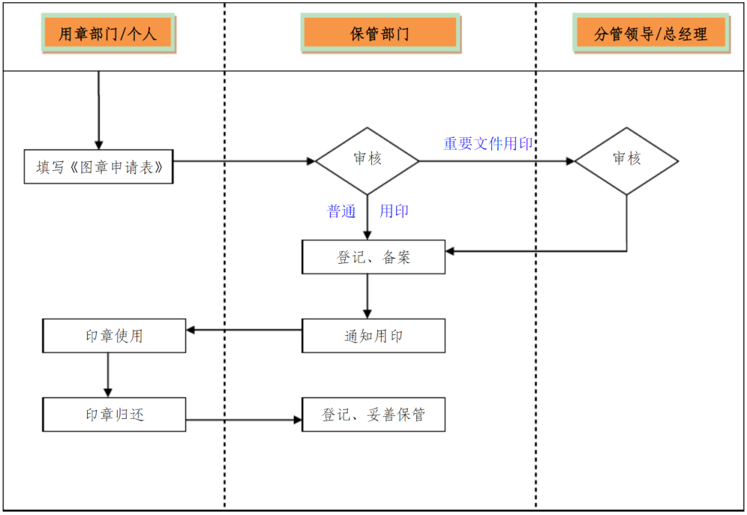 印章管理人员应依据公司实际情况,建立用章审批流程(每类盖章文件具体需经由几人审批),后续严格按照流程实施。用章人员填写申请登记表,经保管部门及公司领导审批后,方可由印章管理人员亲自盖印(盖印前仔细核对申请表上的内容与实际是否一致)。