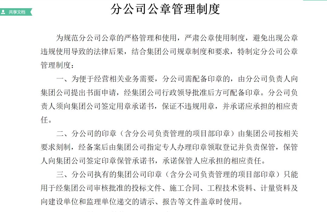 ③ 建立印章管理制度。明确用章的规则、流程及措施,同时保证公司所有人员遵守用章规定。
