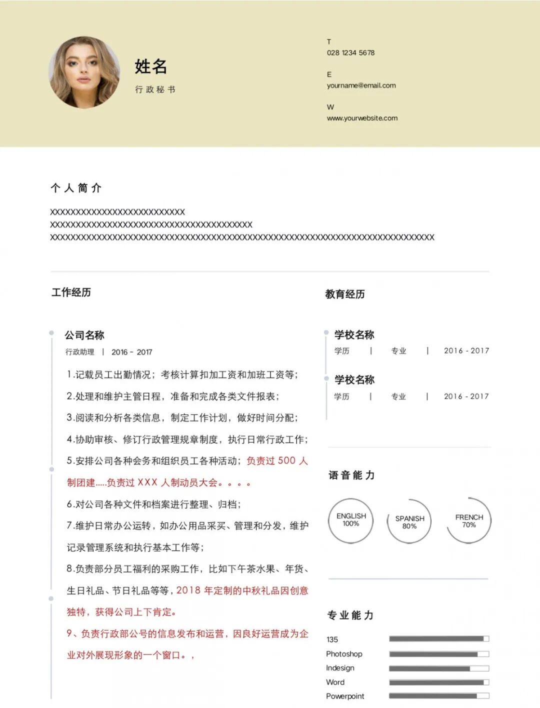 (秘书助理模板示意)