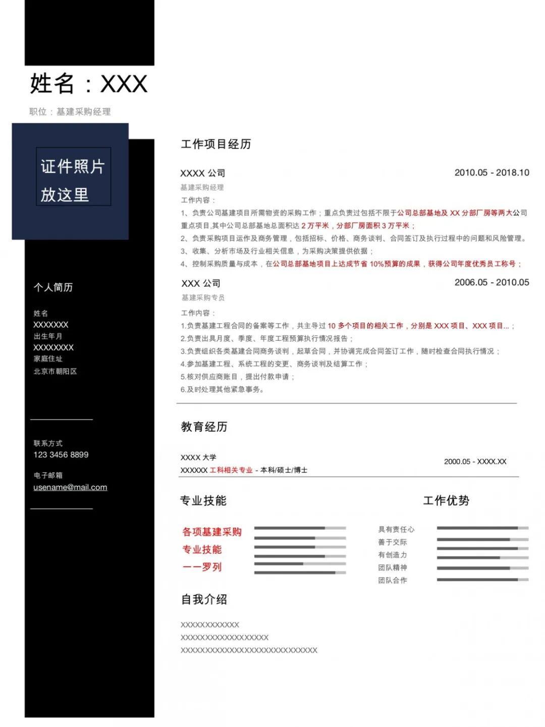 - 优化版:世界500强企业7年行政工作经验,参与过装修、选址、建楼等多类重点项目,获得过优秀员工奖。
