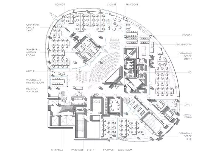 由于公司运营的性质,需要不同活动类型的各种空间,包括有 150 个座位的大型聚会区、小型会议室、员工食堂、休息区、午睡室、接待区……