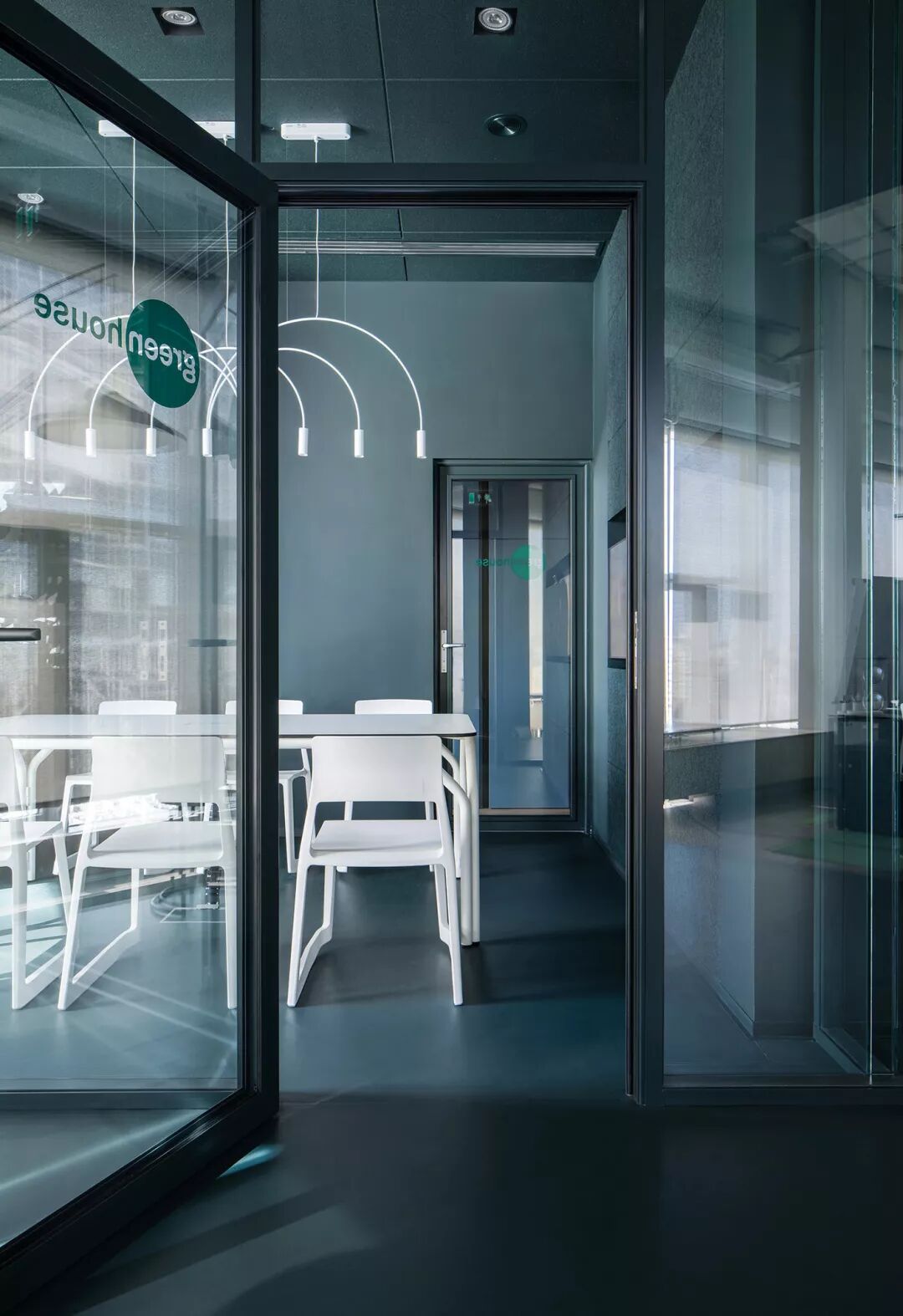在办公室里有时需要完全私密的空间打电话和交谈,设计师还专为客户定制了一个可供 2 人使用的自动隔音房,配有壁挂式的折叠桌和极具私密性的照明,这个隔音房在每个工作区域都有。
