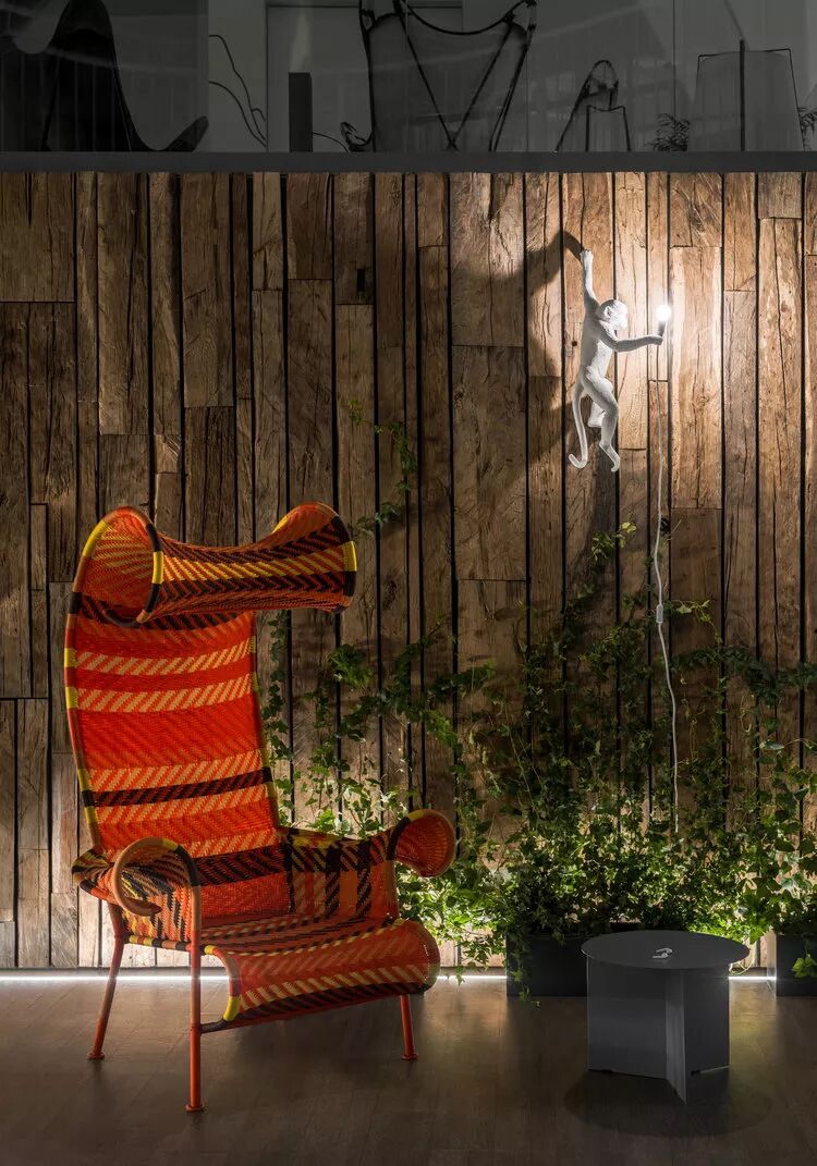前台的休息区以木材为主,并且配以绿植,有一种非常自然的感觉,墙面上的小猴子拿着一盏灯,活泼有趣。